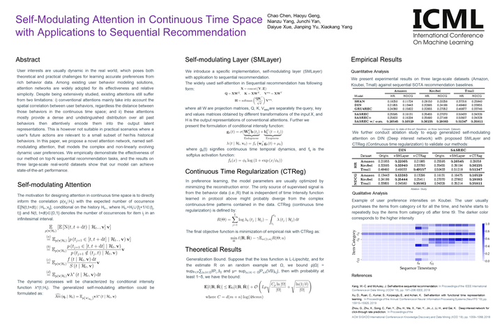User interests are usually dynamic in the real world, which poses both theoretical and practical challenges for learning accurate preferences from rich behavior data. Among existing user behavior modeling solutions, attention networks are widely adopted for its effectiveness and relative simplicity. Despite being extensively studied, existing attentions still suffer from two limitations- i) conventional attentions mainly take into account the spatial correlation between user behaviors, regardless the distance between those behaviors in the continuous time space; and ii) these attentions mostly provide a dense and undistinguished distribution over all past behaviors then attentively encode them into the output latent representations. This is however not suitable in practical scenarios where a user’s future actions are relevant to a small subset of her/his historical behaviors. In this paper, we propose a novel attention network, named \textit{self-modulating attention}, that models the complex and non-linearly evolving dynamic user preferences. We empirically demonstrate the effectiveness of our method on top-N sequential recommendation tasks, and the results on three large-scale real-world datasets show that our model can achieve state-of-the-art performance.